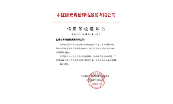 2月9日,中證鵬元資信評(píng)估股份有限公司發(fā)布《信用等級(jí)通知書(shū)》中鵬信評(píng)【2024】第Z【179】號(hào),確定鹽城市海興控股集團(tuán)有限公司主體信用等級(jí)為 AAA,評(píng)級(jí)展望為穩(wěn)定。2024-02-09 -